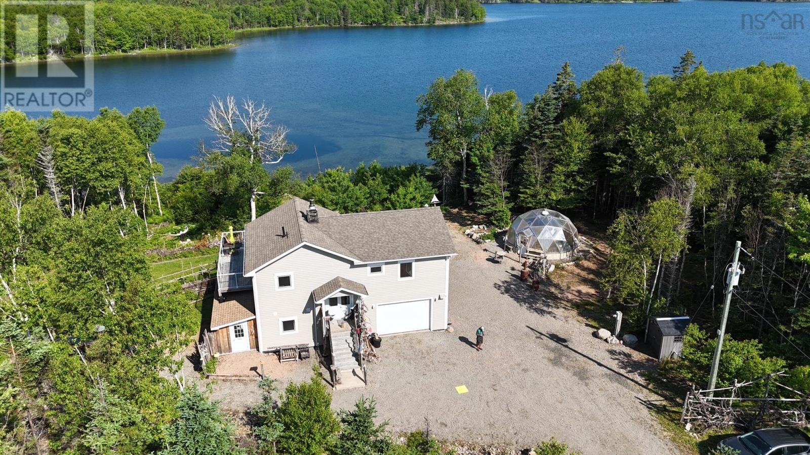 Lakeside Paradise on the Bras dOr Lake A Nature Lovers Dream This spacious and beautifully maintained home, built in 2019, sits in a prime location right on the shores of the stunning Bras dOr Lake. Used only as a vacation residence, the property is in like-new condition and offers the perfect blend of modern comfort, sustainability, and natural beauty. The home is spread over two levels, with a thoughtful layout designed to maximize light with Polytec windows and Patio doors and panoramic views. Large glass panels on the expansive deck ensure uninterrupted panoramic views over the lake, while a woodstove ensures cozy warm nights in fron of a fire. Two of the lower level bedrooms feature walk-out patio doors. The lower level includes a small kitchenette and can be easily closed off as a self-contained apartment, making it ideal for guests, long-term living, or as an income-generating Airbnb rental. Surrounded by a beautiful stand of trees, this property offers true privacy and a peaceful atmosphere. It also boasts a remarkable dome greenhouse, equipped with a heated water tank stocked with fish, a full irrigation system, and climate controlperfect for year-round growing or simply relaxing in a warm, green space during cooler months. Raised garden beds further support a self-sustainable lifestyle. The property also includes a spacious, build in, double garage with ample shelving for storage or workshop needs and 2 sheds as well as plenty of firewood. Gentec generator connection and generator are in place. Fibre is available. The last part of the power and e net to the house are underground. The area is famous for its trout fishing and perfect for boating, sailing, surfing and all kind of water fun. Whether you're a gardener, water enthusiast, or simply seeking a serene lifestyle, this home offers an exceptional opportunity as a permanent residence, vacation getaway, or investment property. (id:2494)