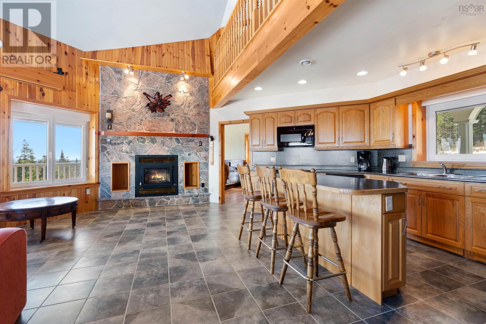 Spectacular lake view retreat with panoramic Bras d'Or Lake views. This extraordinary 4-bedroom, 3.5-bathroom custom residence is set on 178 acres of woodland. This 3,331 sq. ft. home offers unparalleled craftsmanship and breathtaking views of the world-famous Bras d'Or Lake. Built with state-of-the-art Insulated Concrete Form (ICF) construction, this residence delivers superior energy efficiency, soundproofing, and structural integrity. The striking exterior showcases meticulously hand-laid granite and sandstone complemented by stylish stacking brick. Every detail has been thoughtfully curated to create a home of exceptional quality and aesthetic appeal. The main level boasts an open-concept living area with cathedral ceilings and a magnificent stone fireplace centrepiece. The architectural design features windows positioned to frame the breathtaking lake views from multiple angles, while patio doors lead to a panoramic balcony. Throughout the home, the windows are equipped with high-quality built-in exterior room darkening blinds, providing light control and privacy when desired. The upper level features a loft overlooking the main living space, plus a spacious primary bedroom and versatile additional room. The fully finished walkout basement includes a recreation room with wood stove, beautifully crafted stone wall and hearth, and patio access. Premium features include in-floor heating (basement and main level), heated 26'×32' attached garage with 16' and 9' doors and Generac propane generator for uninterrupted power. Set on diverse woodland, this property offers the perfect balance of privacy and accessibility while capturing unobstructed lake views. This amazing residence must be viewed in person to truly appreciate the exceptional craftsmanship throughout. (id:2494)