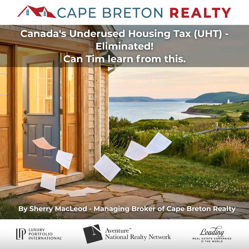 By Sherry MacLeod Managing Broker of Cape Breton Realty For the past few years, the federal Underused Housing Tax (UHT) has been a regular source of confusion, frustration, and no small amount of paperwork for property owners across Canada – particularly in rural and seasonal markets like those found throughout Cape Breton and Northeastern Nova Scotia. The tax was introduced as a 1% annual levy aimed largely at non-resident owners of vacant or underused homes. The idea was to discourage speculation and help free up housing supply. On paper, that sounded sensible enough. On the ground, however, the UHT quickly became a case study in how good intentions can get lost in complexity. In the federal government’s most recent budget, tabled in November 2025, Ottawa quietly (thankfully) signalled that it had heard the message. As part of Budget 2025, the federal government introduced legislation that would eliminate the Underused Housing Tax for the 2025 calendar year and beyond, and -just as importantly remove the requirement to file UHT returns for those years. Once enacted, that means no tax and no annual filing starting with 2025. YES!!!! For most property owners, this change will first be felt in 2026, when they might otherwise have